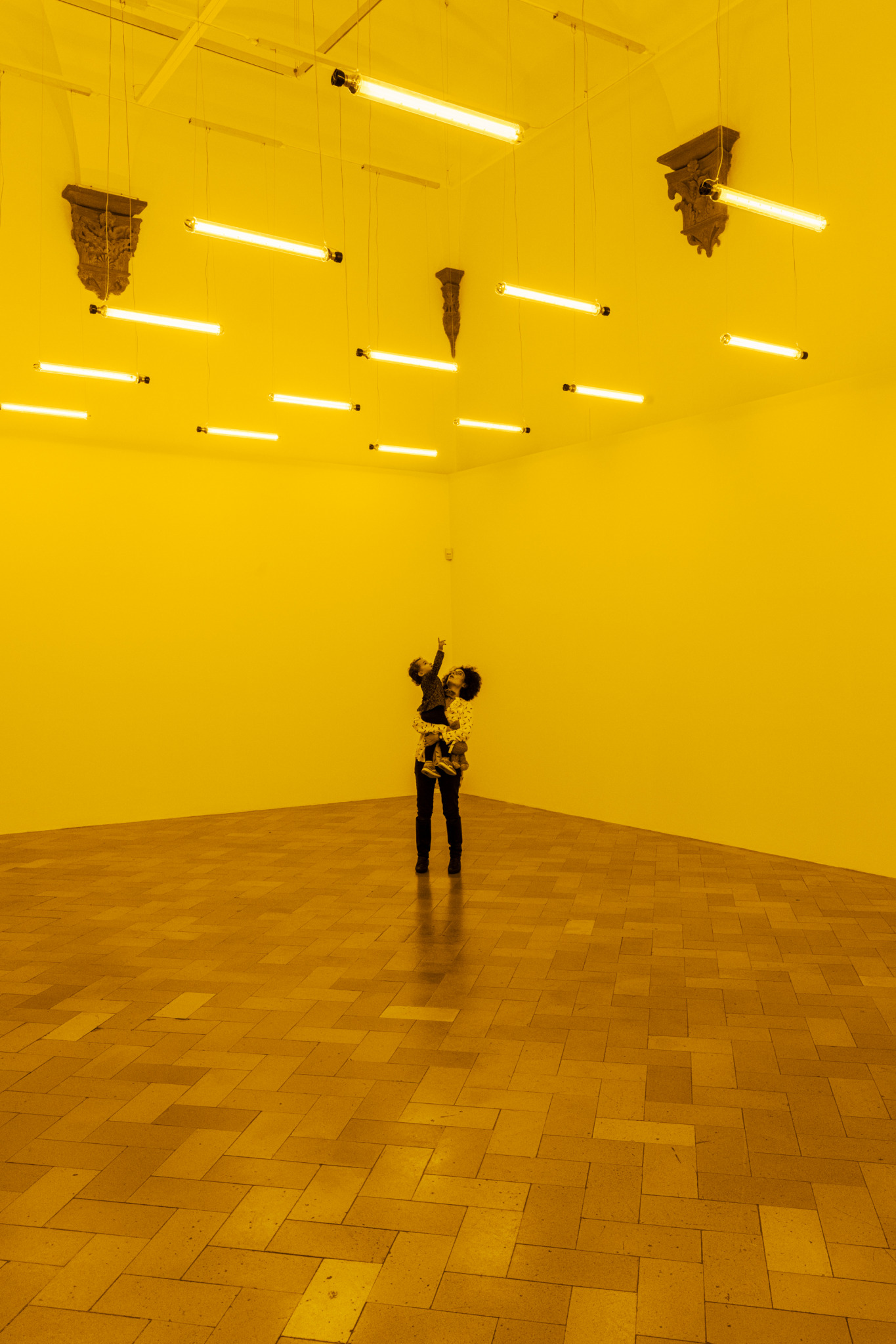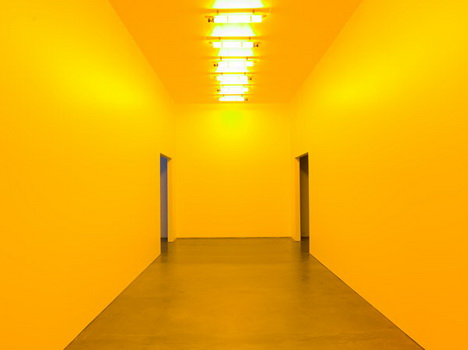Monofrequency lights mounted to the ceiling of a white room emit a narrow range of yellow light, reducing visitors’ color perception to shades of yellow and black. The longer the visitors stay in the space, the more they begin to perceive subtle color distinctions and to correct for the yellowish lighting. Upon leaving,they momentarily perceive a bluish afterimage.