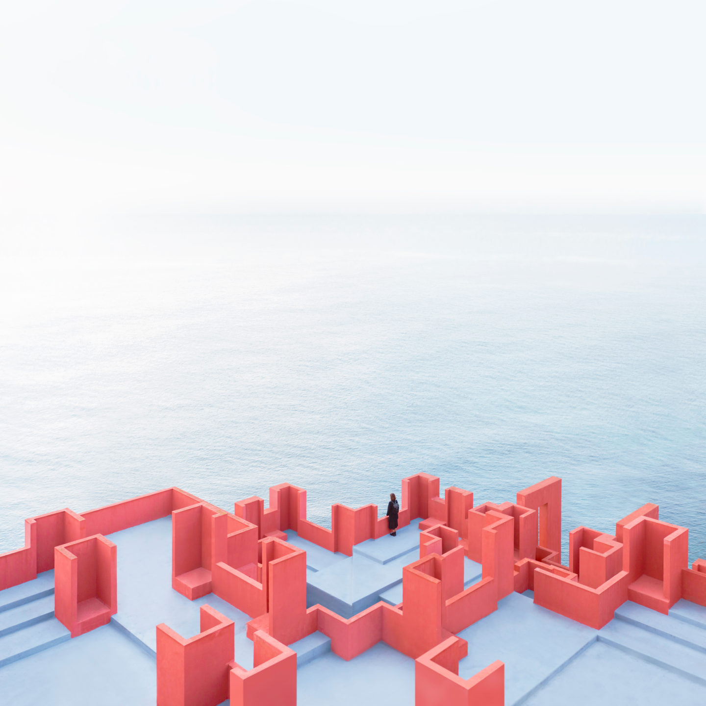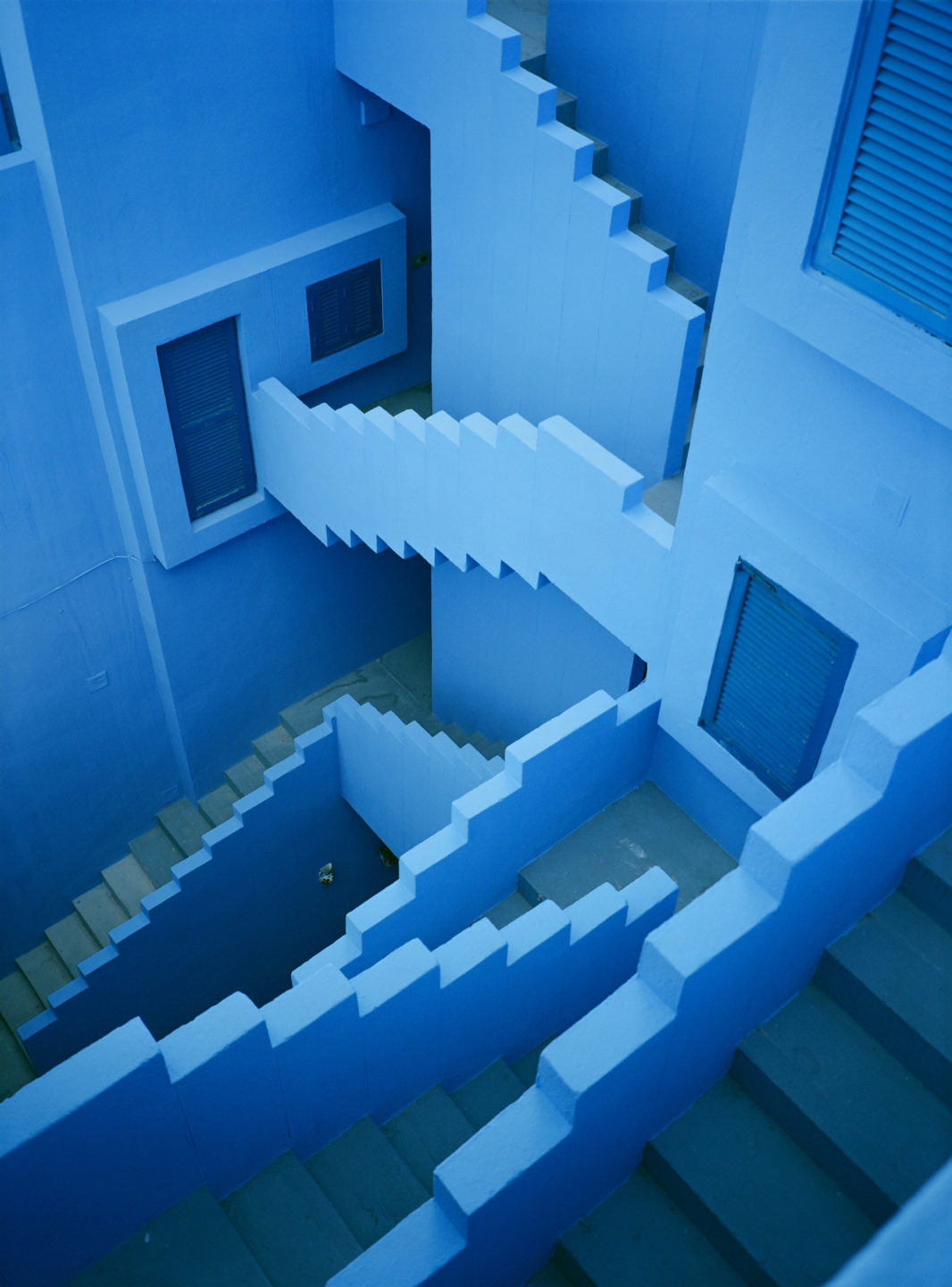 Un ejemplo icónico de cómo el color y la luz pueden construir la identidad perceptiva de un lugar es La Muralla Roja de Ricardo Bofill (Calpe, 1973). Aquí, la composición geométrica del edificio se funde con la intensidad de la luz mediterránea, transformando las superficies coloreadas en un laberinto óptico que cambia de aspecto a lo largo del día. Como se destaca también en el blog de LZF Lamps (Building Brilliance: La Muralla Roja – The Red Wall, 2023), la paleta cromática de Bofill —desde el rojo carmín hasta el azul violáceo— dialoga constantemente con la luz natural, generando una experiencia espacial y sensorial en continua evolución.
