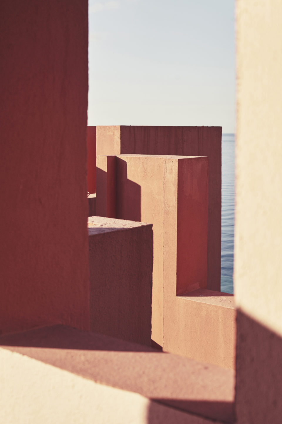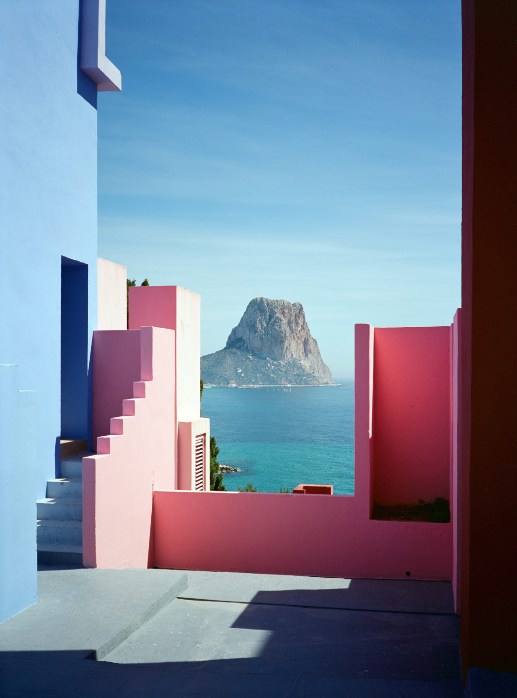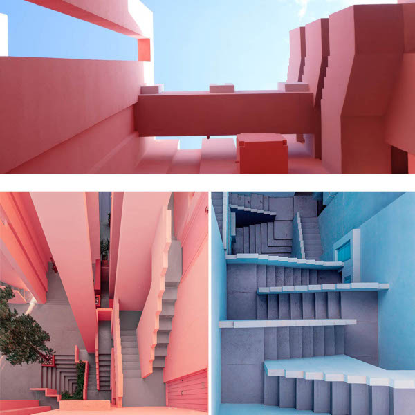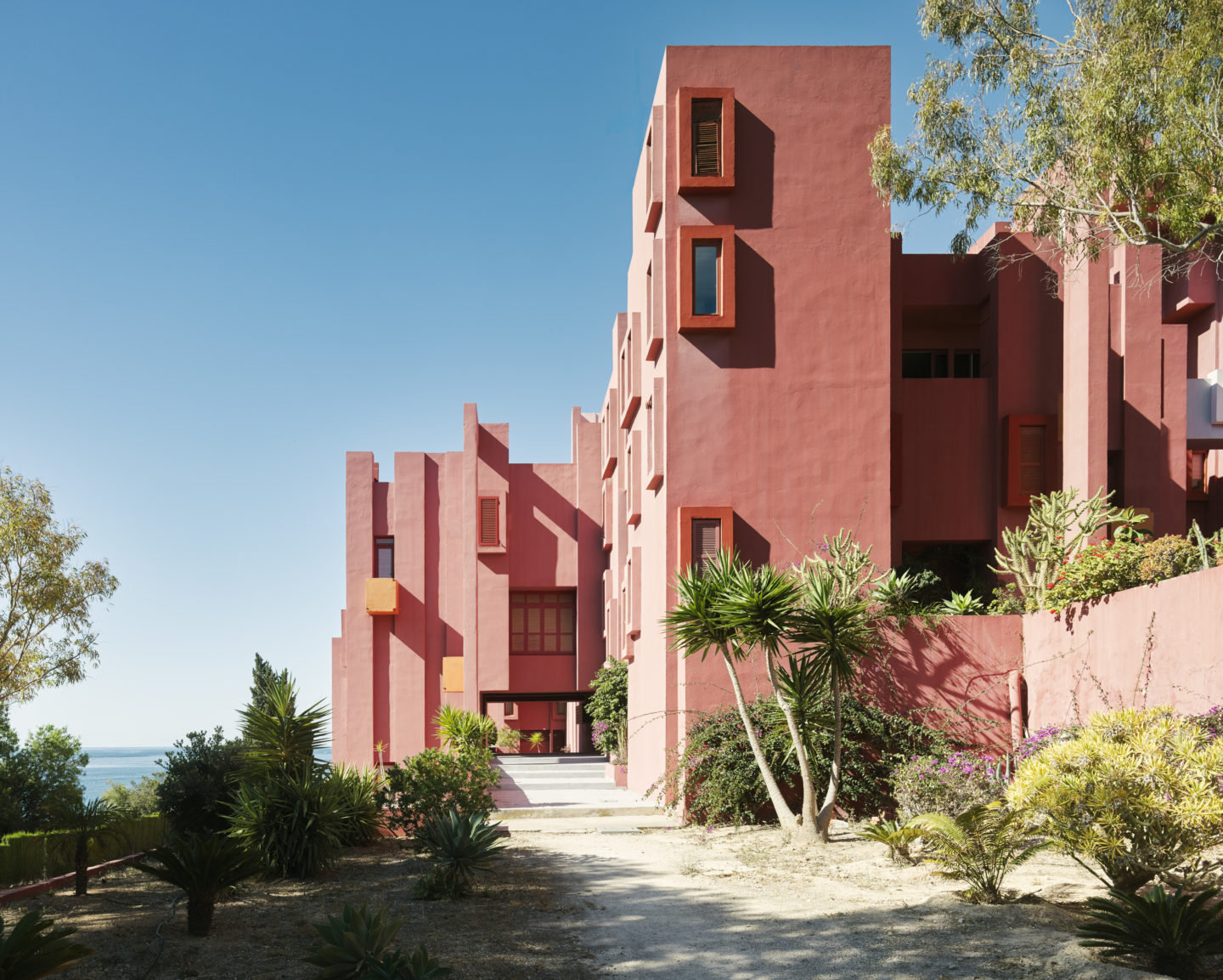 Un ejemplo icónico de cómo el color y la luz pueden construir la identidad perceptiva de un lugar es La Muralla Roja de Ricardo Bofill (Calpe, 1973). Aquí, la composición geométrica del edificio se funde con la intensidad de la luz mediterránea, transformando las superficies coloreadas en un laberinto óptico que cambia de aspecto a lo largo del día. Como se destaca también en el blog de LZF Lamps (Building Brilliance: La Muralla Roja – The Red Wall, 2023), la paleta cromática de Bofill —desde el rojo carmín hasta el azul violáceo— dialoga constantemente con la luz natural, generando una experiencia espacial y sensorial en continua evolución.